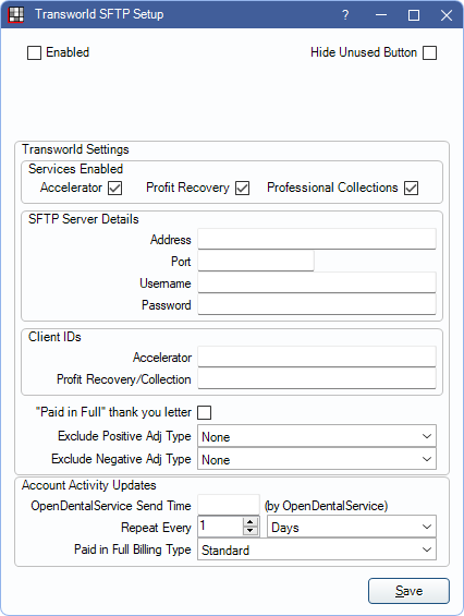 - OpenDentalService Send Time: Select when data will be sent and synced with Transworld (e.g., 6pm, 6:51 PM, 19:00). We recommend setting a time after business hours. If left blank, transaction data is not synced.