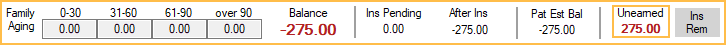 The payment will show as a credit line item in the Patient Account, affecting the patient's balance. The family's total unallocated amount will show under Unearned in the top aging bar. Hover over the total to view a breakdown of the family's unallocated, unearned balance. All unallocated prepayments within the family are summed by unearned income type. No breakdown is displayed if the total unearned balance is zero.