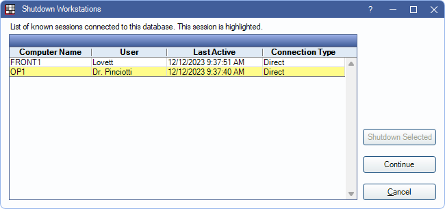 - Any open workstations are listed. Open Dental must be closed on all workstations when an update is performed. Click Continue to close Open Dental on the workstation and proceed with the installation.