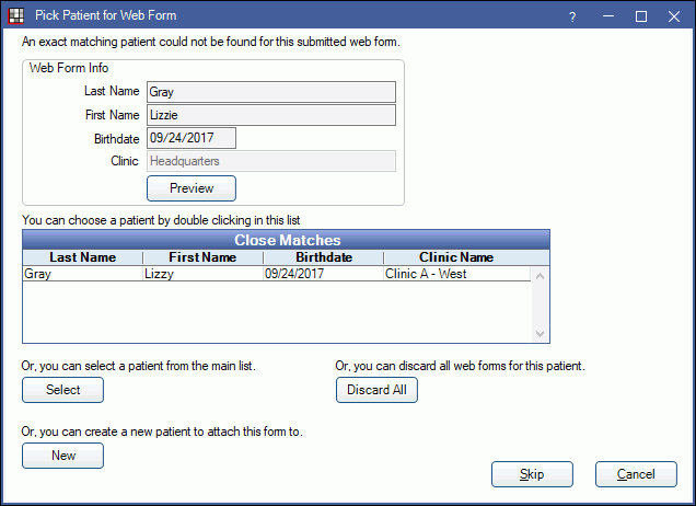 - If there is more than one match, email address and phone number will also be considered. If at least one phone number or email address matches any phone number or email address on file, the web form will be retrieved. If neither phone nor email has a match, a prompt will display to pick a patient or skip retrieval.