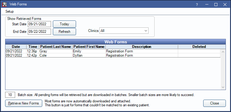 - If Enable automatic download of web forms is checked in Web Form Setup, forms that have a patient match will automatically download. Forms that do not have a patient match (e.g., new patients) must still be retrieved using this button.