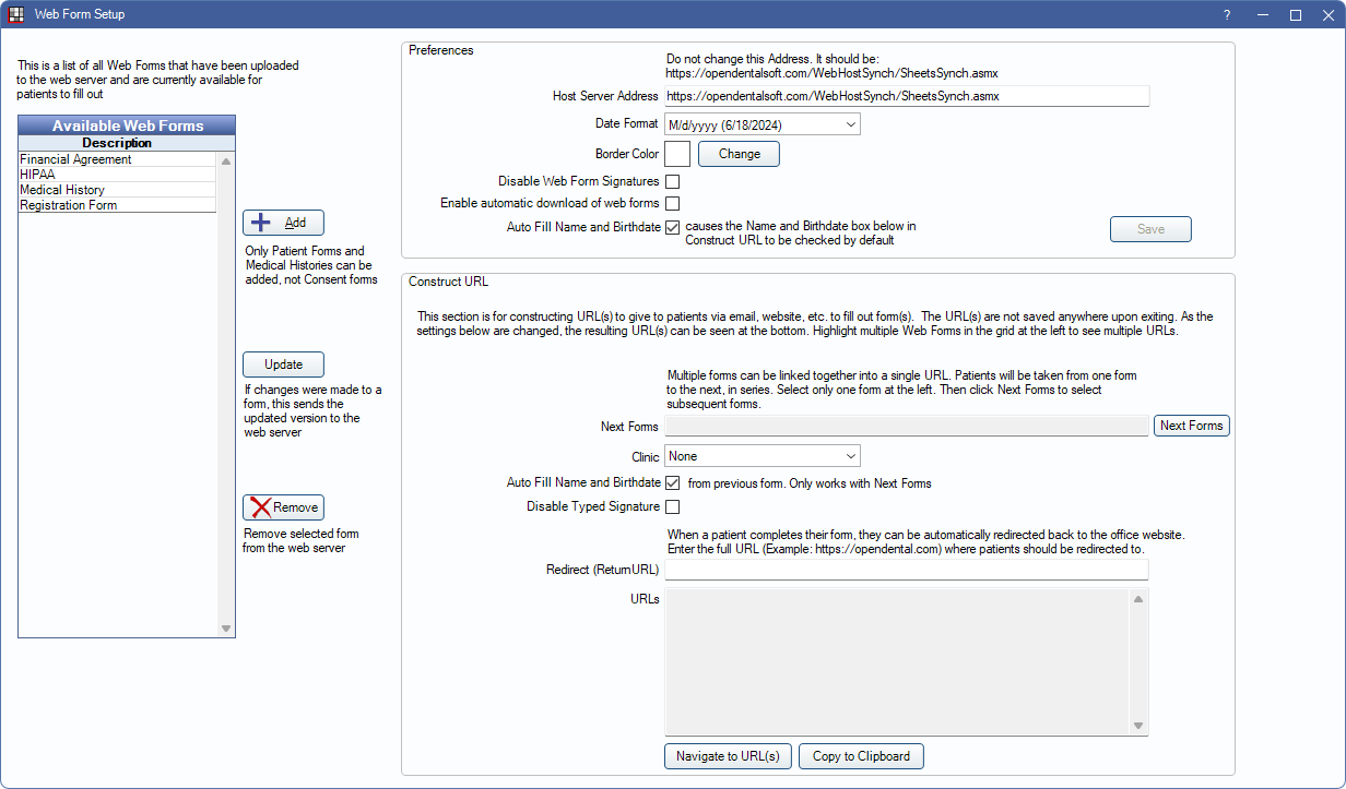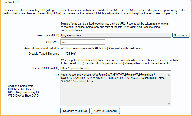 Redirect URL: When patients complete their forms, they can be automatically redirected back to the office website. Enter the full URL (e.g., https://opendental.com) where patients should be redirected to. The URLs area will update to include the redirect code.