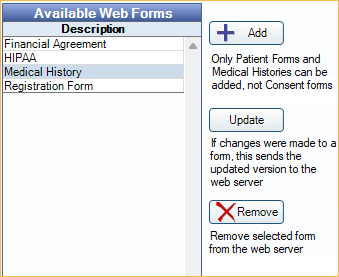 Remove: Highlight a form, then click to delete it from the Available grid. The form will no longer be available for online use.