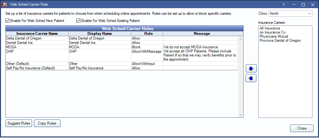 Enable for Web Sched Existing Patient: Enable Carrier Rules for Web Sched Existing Patient. If using clinics, use the Clinic dropdown to enable for each desired clinic.