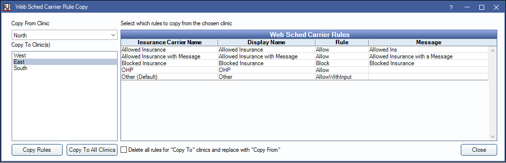 - Delete all rules for "Copy To" clinics and replace with "Copy From": Determines which rules remain for the Copy To clinic.