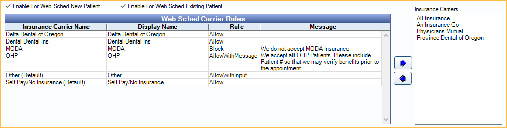 Web Sched Carrier Rules determine if patients are allowed to enter insurance information when scheduling an appointment via Web Sched New Patient or Web Sched Existing Patient.
