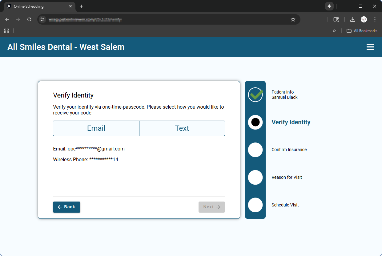 - The patient must have a phone number or email address entered in Open Dental. If only one field is entered, that is the field the authentication code is sent to.