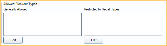 - Restricted to Recall Types: Lists blockouts that have been restricted to a specific Recall Type. Click Edit to open the list of Recall Types, then double-click a type to open Recall Types. From the Recall Types window, associate a blockout type.