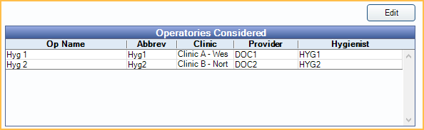 Lists the operatories considered for available timeslots. Only operatories marked Is Web Sched are considered.
