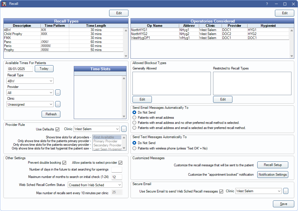 - Recall Setup: Default settings for the Recall List affect when and to whom automated Web Sched Recall reminders are sent, as well as the message content and maximum number of reminders. Click to review settings. See Setup Recall.
