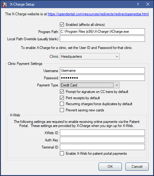 - Enable X-Web for patient portal payments: Check to allow patients to make a payment online (not required if only using Automatic Recurring Charges).
