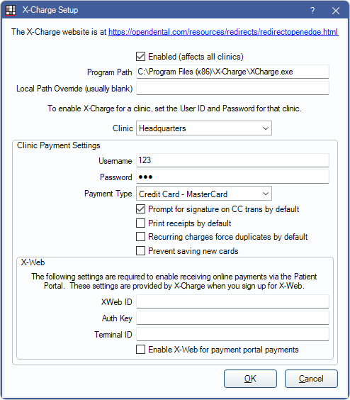 - Enable X-Web for Payment Portal payments: Check to allow patients to make payments online using the Payment Portal (not required if only using Automatic Recurring Charges).