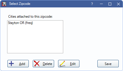 - If the zip code does not exist in the main list, opens the Edit Zip Code window. Allows the user to quickly add the zip code to the main list.