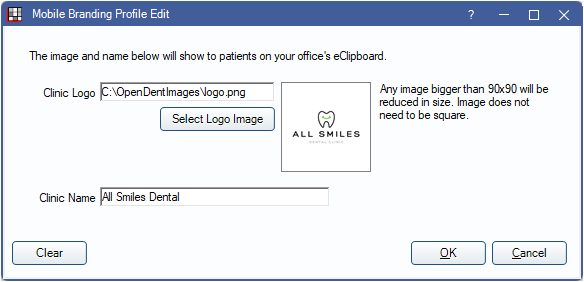 Clinic Logo: The location of the clinic logo. Click Select Logo Image to browse for the image.