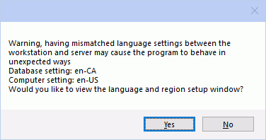Solution: This warning means the database setting for language and region is different than the computer's setting. You can change the computer setting to match the database setting, change the database setting to match the computer setting, or leave settings as is. You can also stop this warning from showing on this computer. In Preferences, click [...] next to Language and region used by program, then check the Do not show this window on startup box.