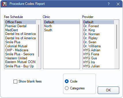 The Procedure Codes - Fee Schedule report prints procedure fees by fee schedule. If clinic and/or provider-specific fees have been entered, a report of the fees that differ by provider/clinic can also be printed.