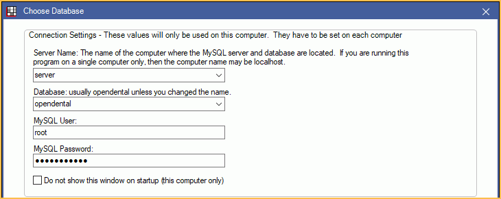 Users and password: If you change passwords and it no longer works, carefully retrace your steps to make sure the new user has all privileges and access to the Open Dental database. Be aware of the difference between user@% and user@localhost. Double-check the privileges and try again.