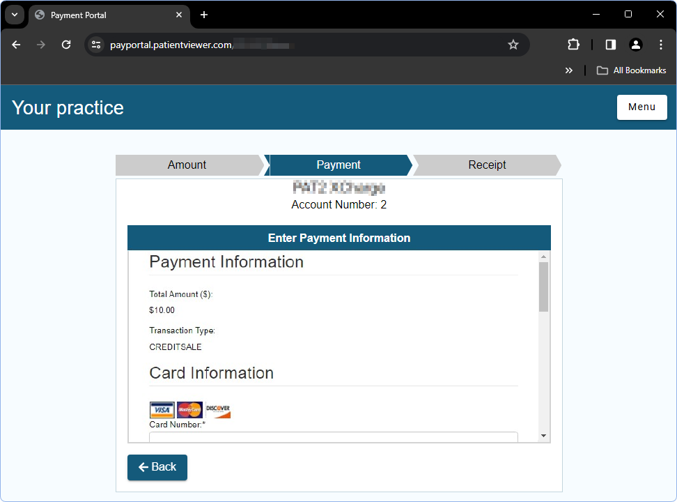 From here, patients can enter their card number and continue with payment. Screens and fields may vary depending on the payment processor.