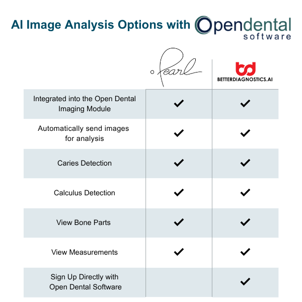 Open Dental is integrated with two AI Image Analysis companies to process images through the Imaging Module.