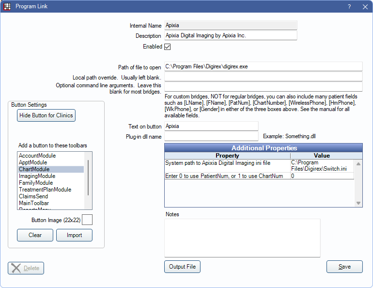In the Main Menu, click Setup, Program Links. Double-click on Apixia Digital Imaging by Apixia Inc.
