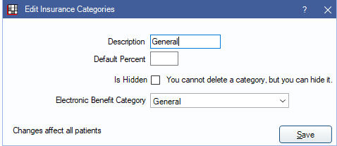 Existing insurance plans will continue to use the old insurance categories and percentages unless the plans are manually edited. To do so, we recommend changing insurance plan Benefit Information via the Insurance Plans (Lists, Insurance Plans) so all subscribers are affected by the change.