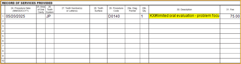 When printing the claim, KX# or GY# is prepended to the procedure description in box 30 of the ADA Claim Form.