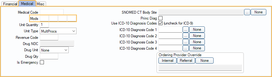 In Procedure - Medical Tab, is the Mods area. Claim modifiers can be entered here.